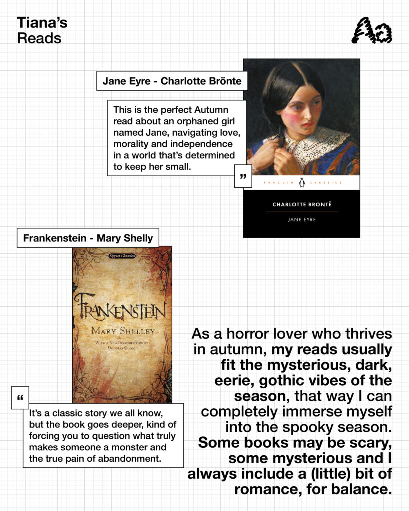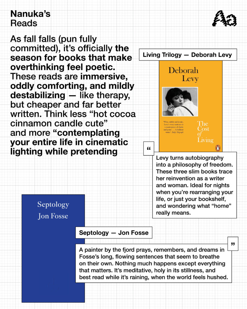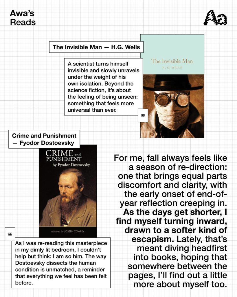 The days are getting shorter, the air feels heavier, and somehow our bookshelves are growing taller. For this season’s reading list, we turned to Tiana, Nanuka, and Awa: three minds who find comfort (and occasional chaos) in the written word.