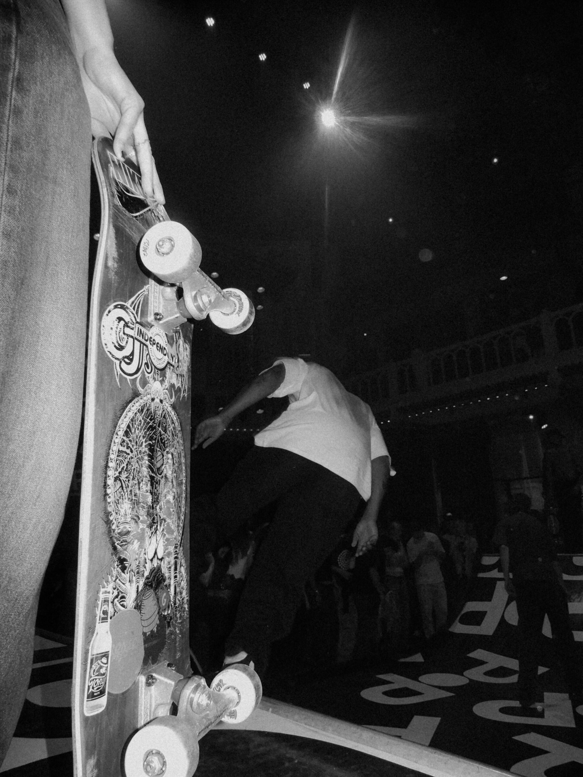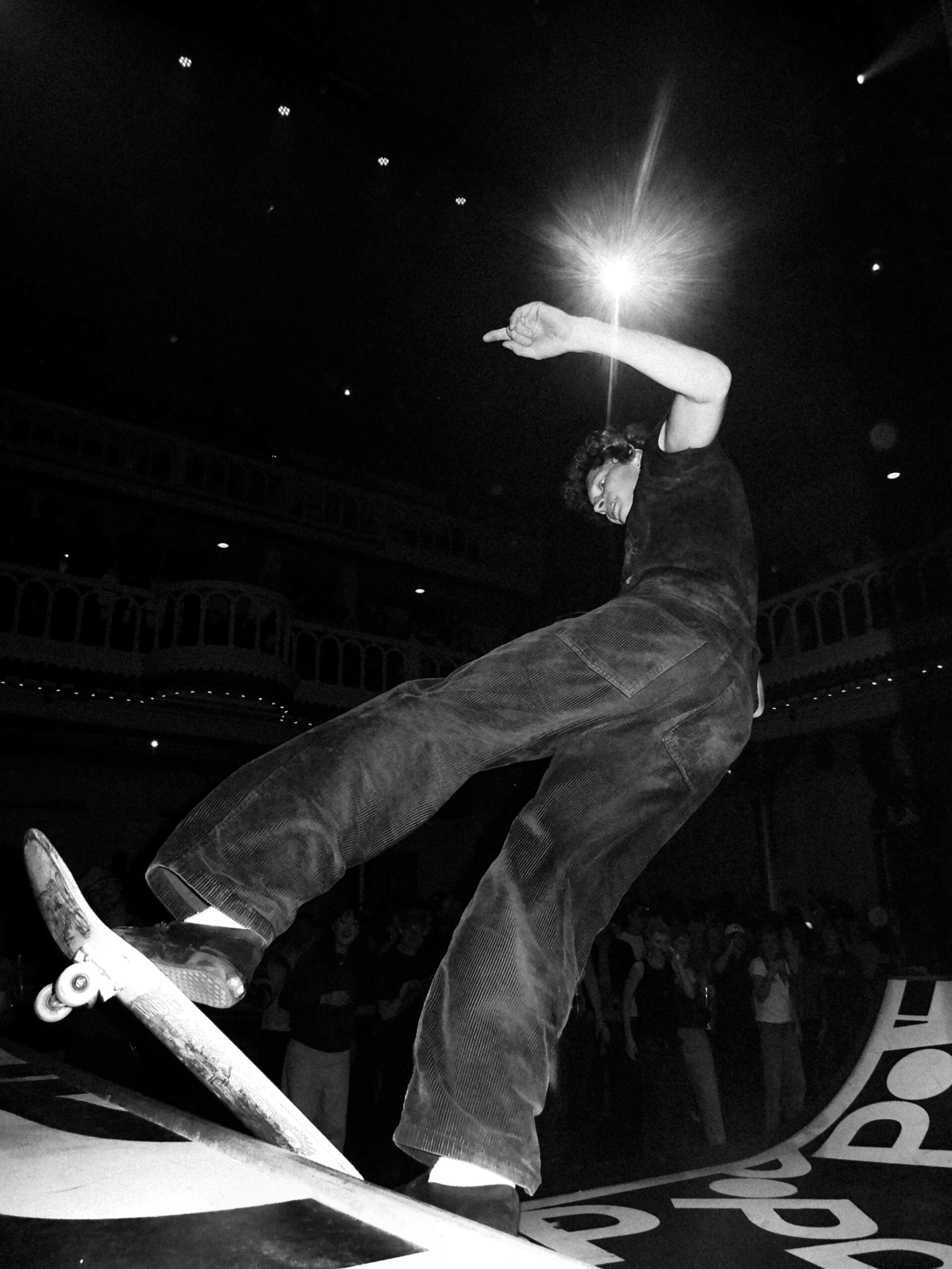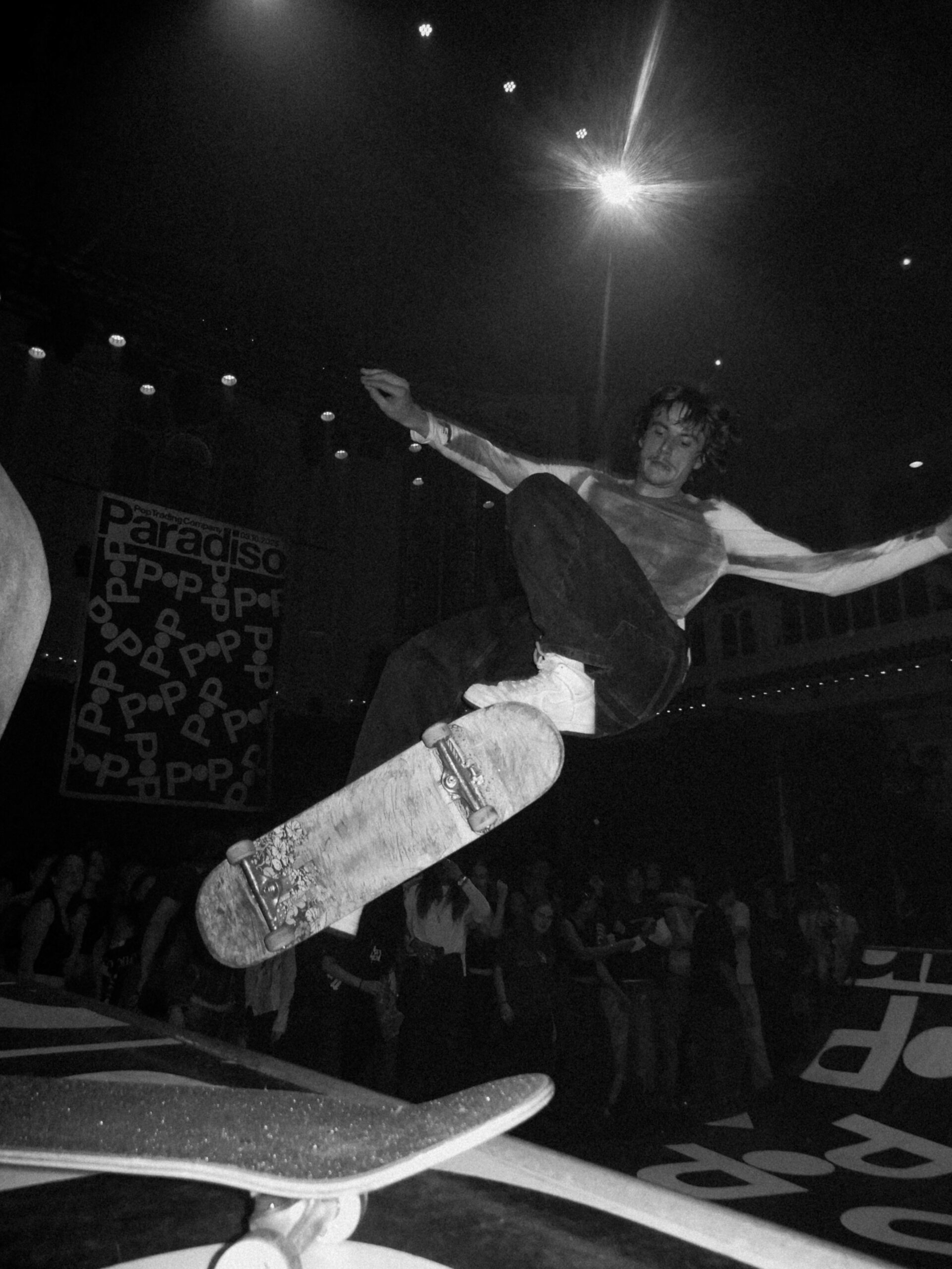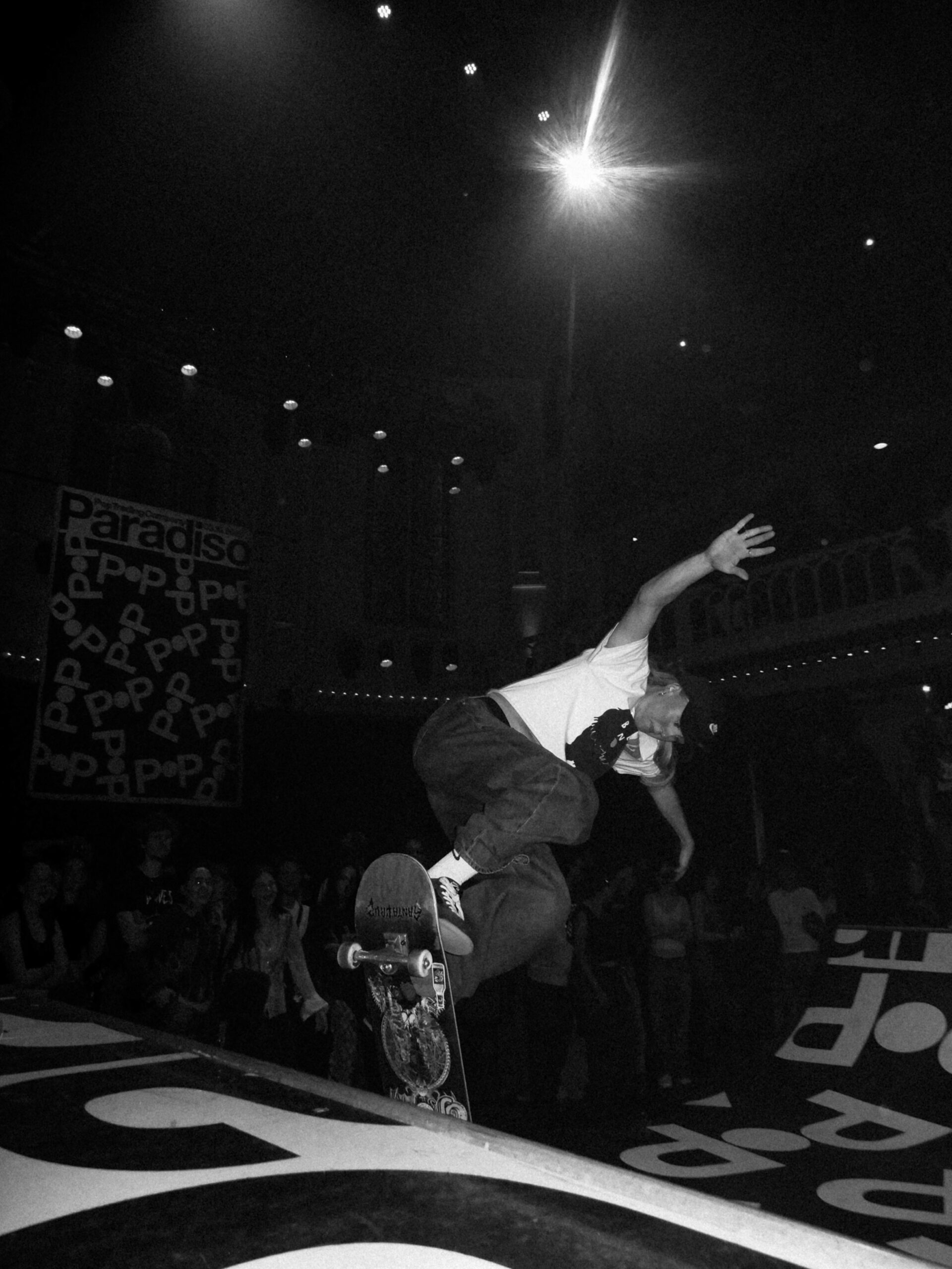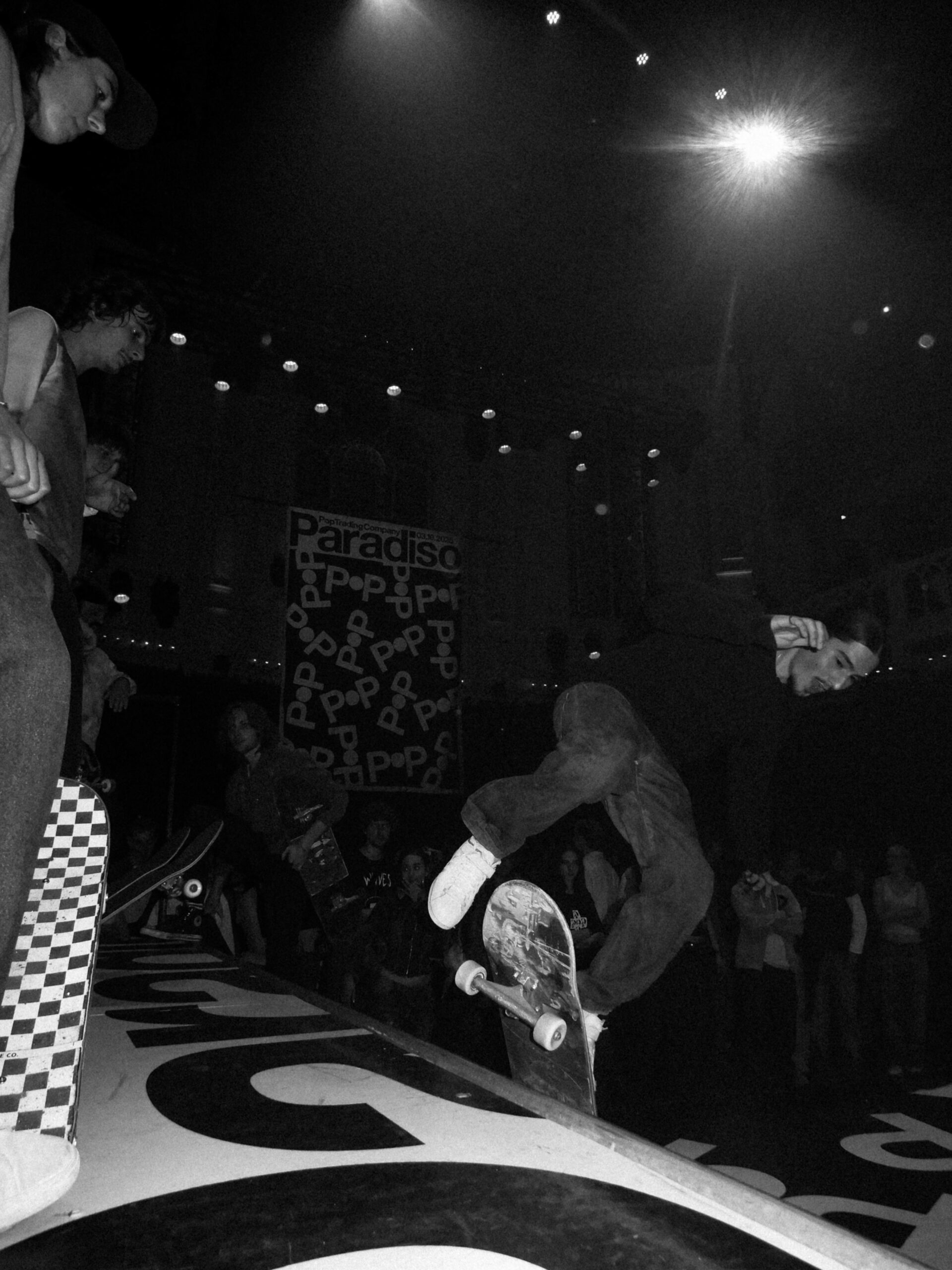 On Friday, for the first time in 40 years, skaters returned to Paradiso. Pop Trading Company installed a half-pipe in the center of the main hall, inviting partygoers to bring their own board.