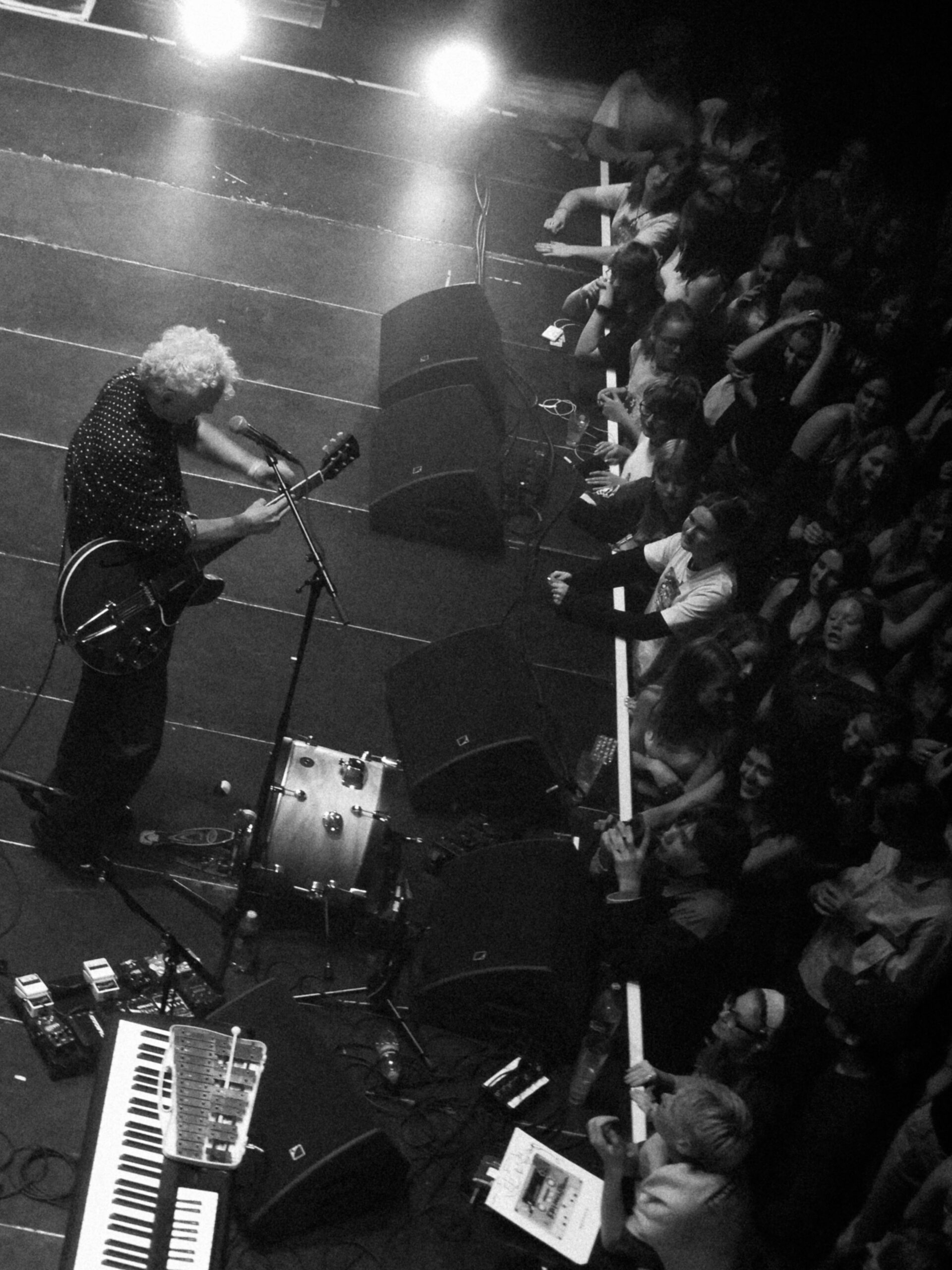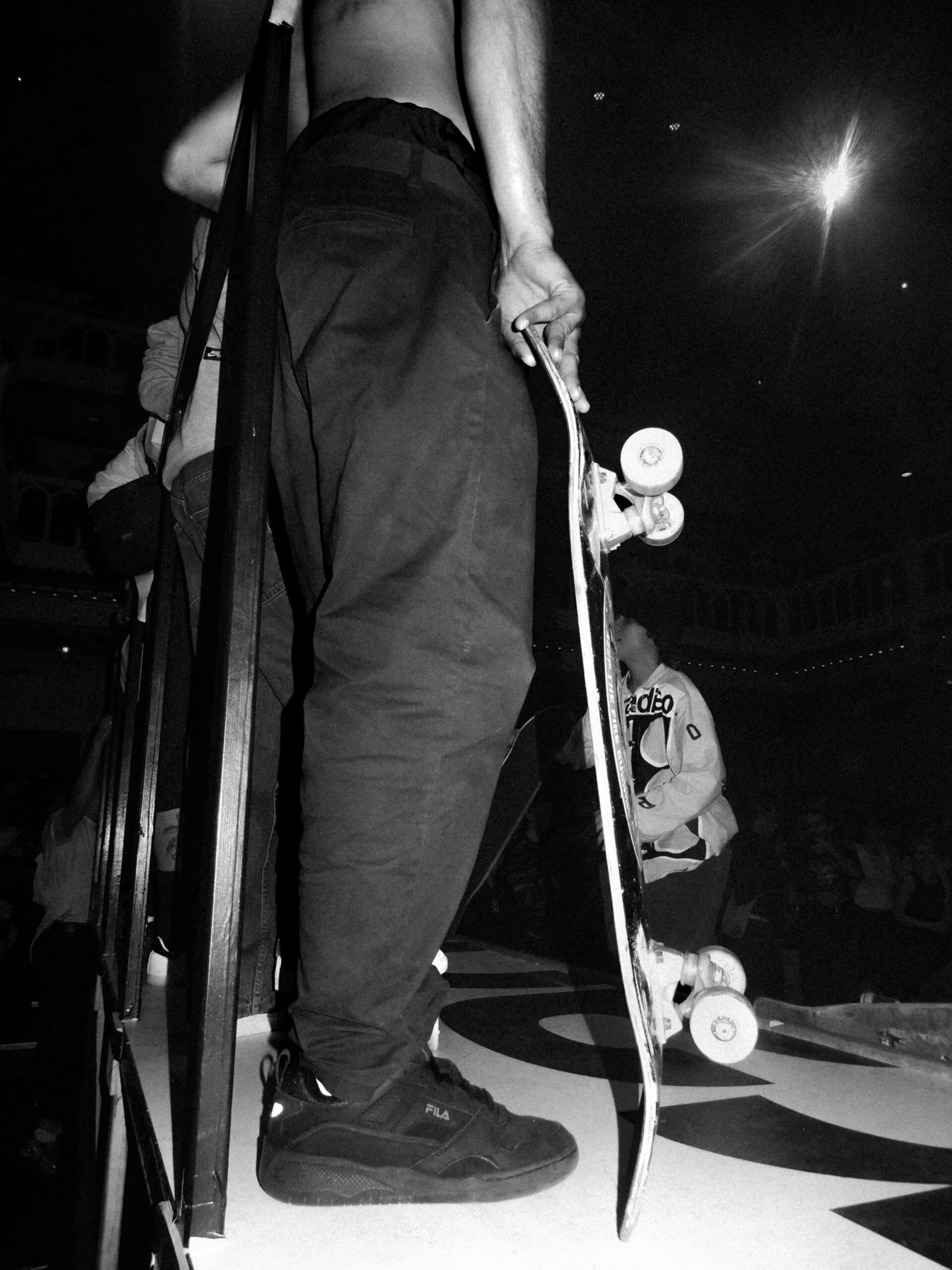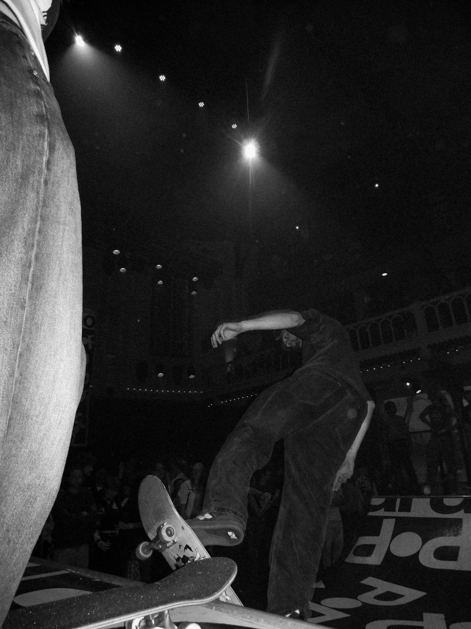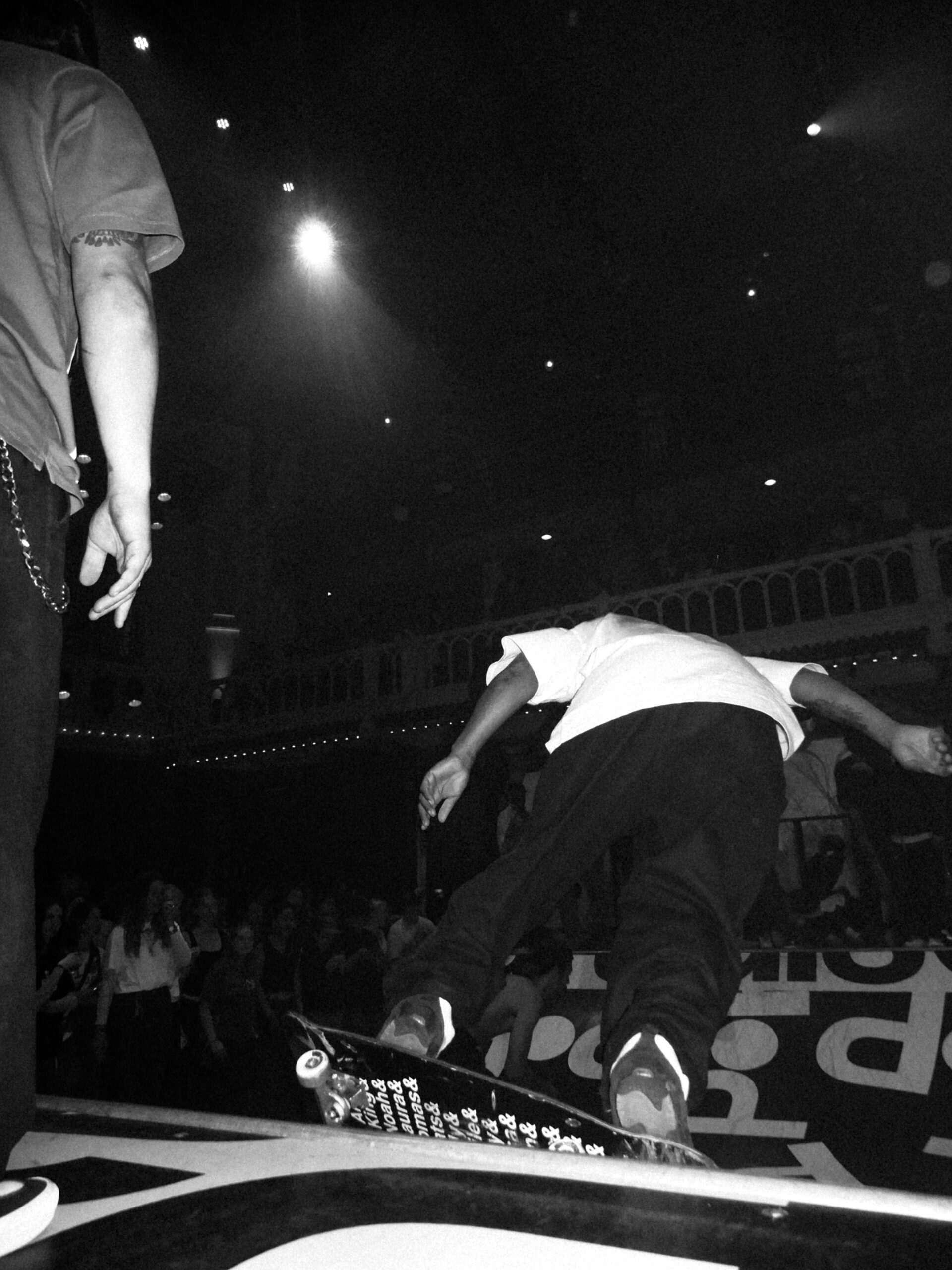 From the crowd, hypnotized by the rhythmic back and forth of boards coming sometimes inches from our faces, we watched the skaters against the looming backdrop of the venue’s iconic stained glass windows. The crowd erupted in turn into sympathetic hisses during particularly gnarly wipeouts and thunderous applause whenever a skater approximated a trick (the tricks were few and far between). Privately, I was rooting for a blonde girl in low-slung bedazzled denim.