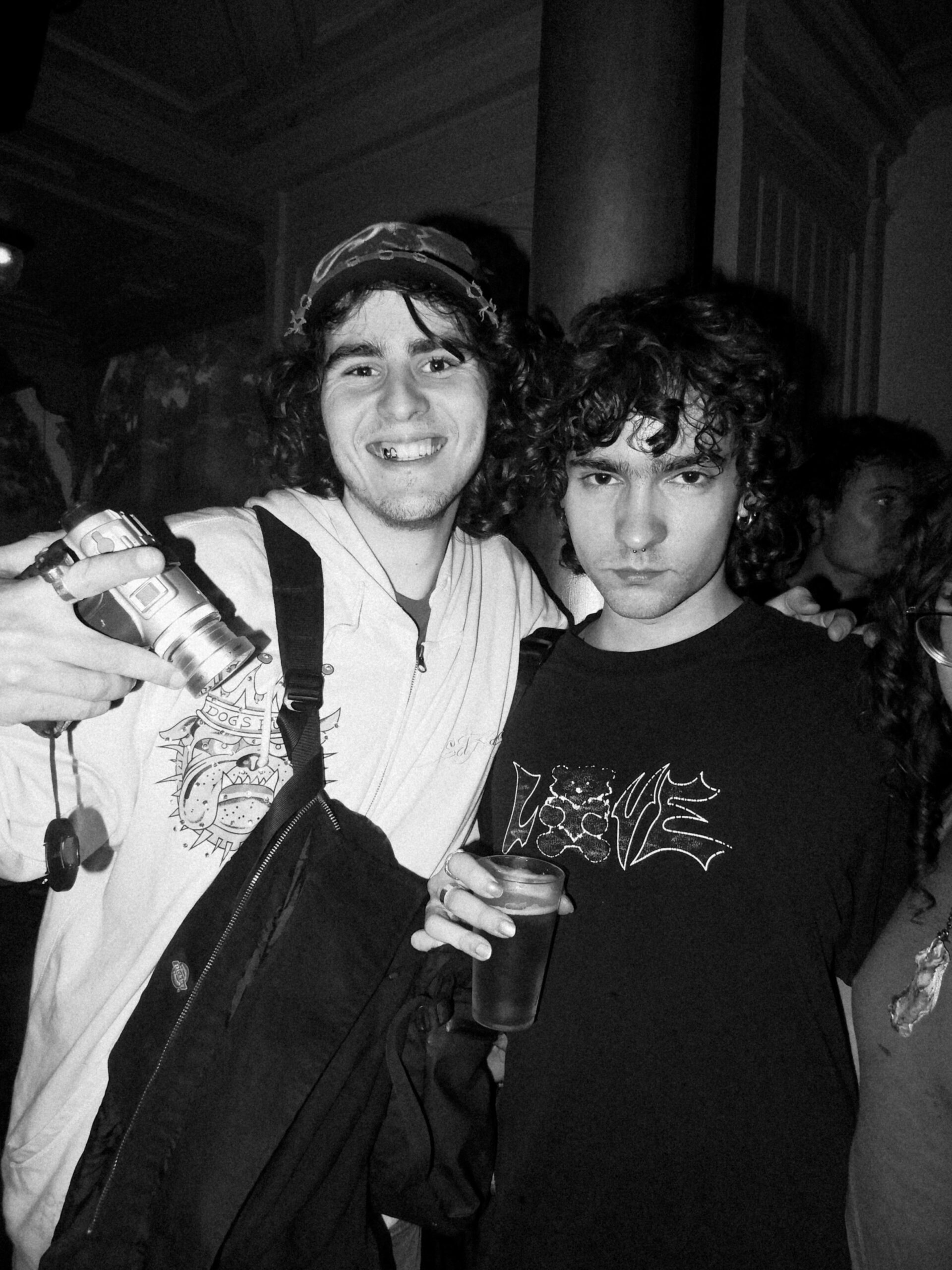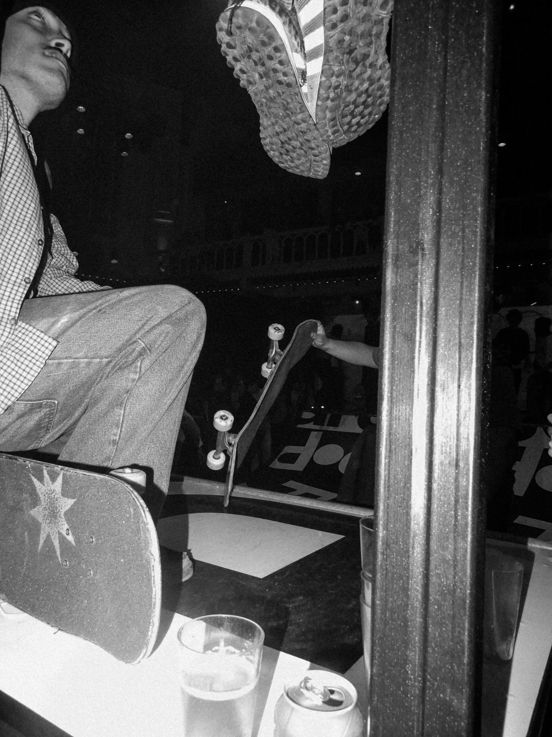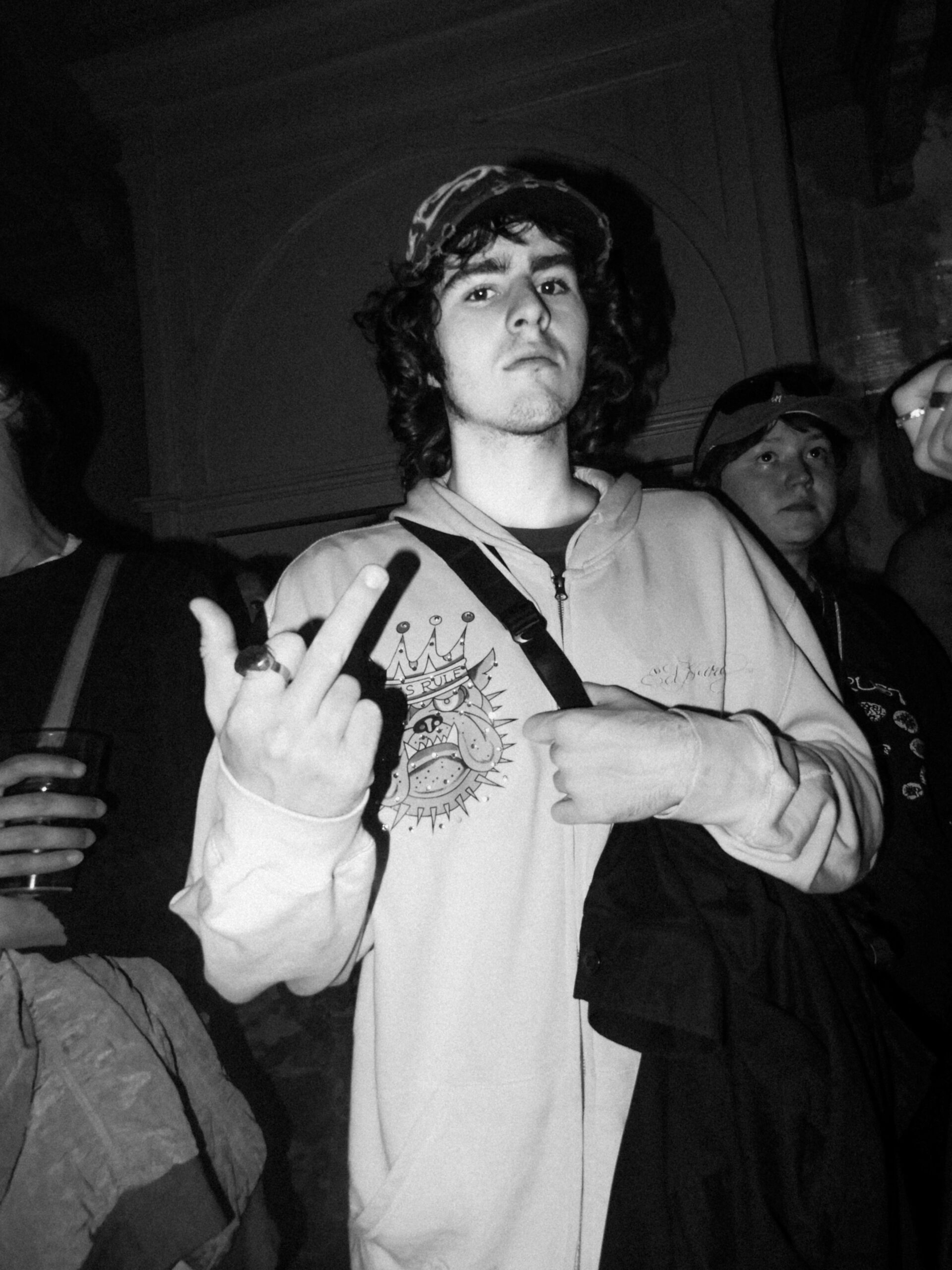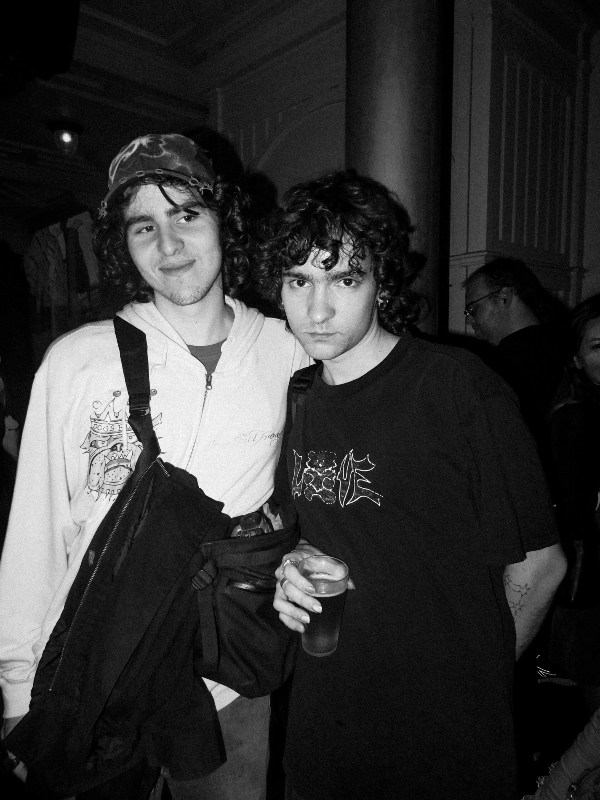 Outside, rain-soaked smokers on the steps looked perfectly disheveled, sporting smudged eyeliner and windswept hair. A very 2010s party nostalgia, complete with boards, backwards caps, and oversized graphic tees.
