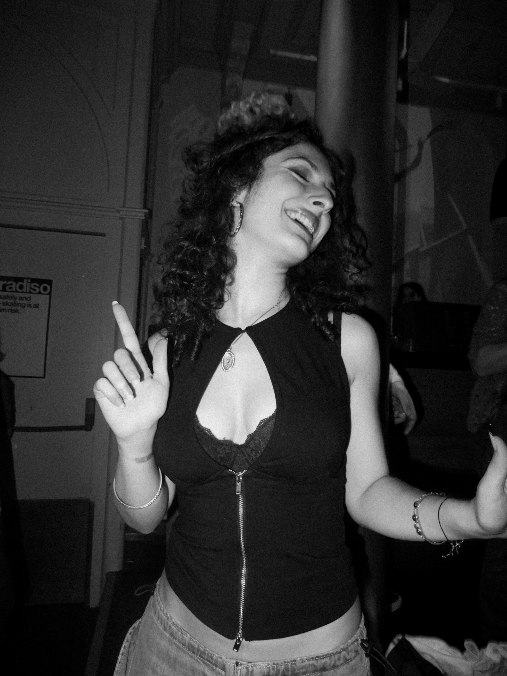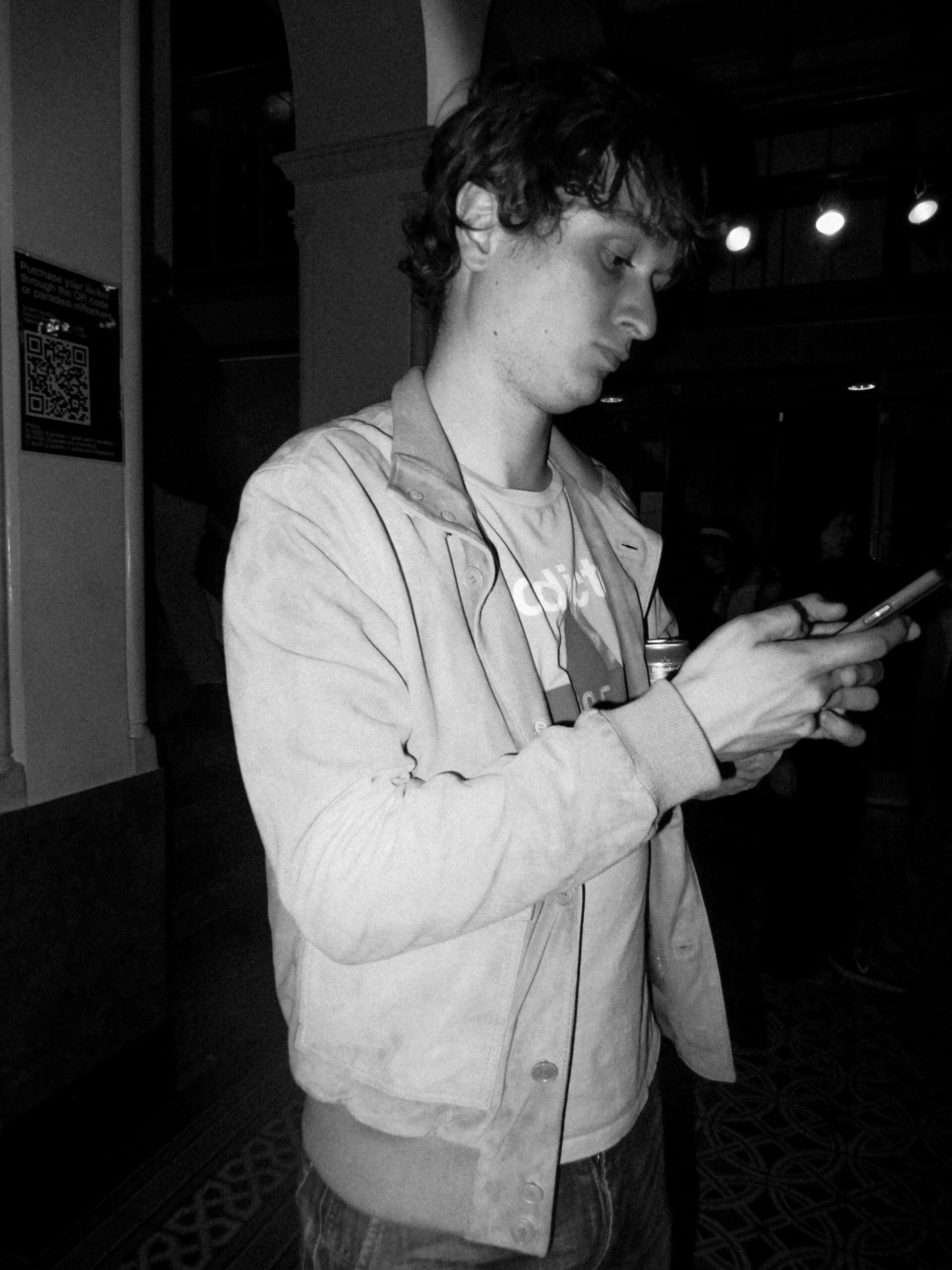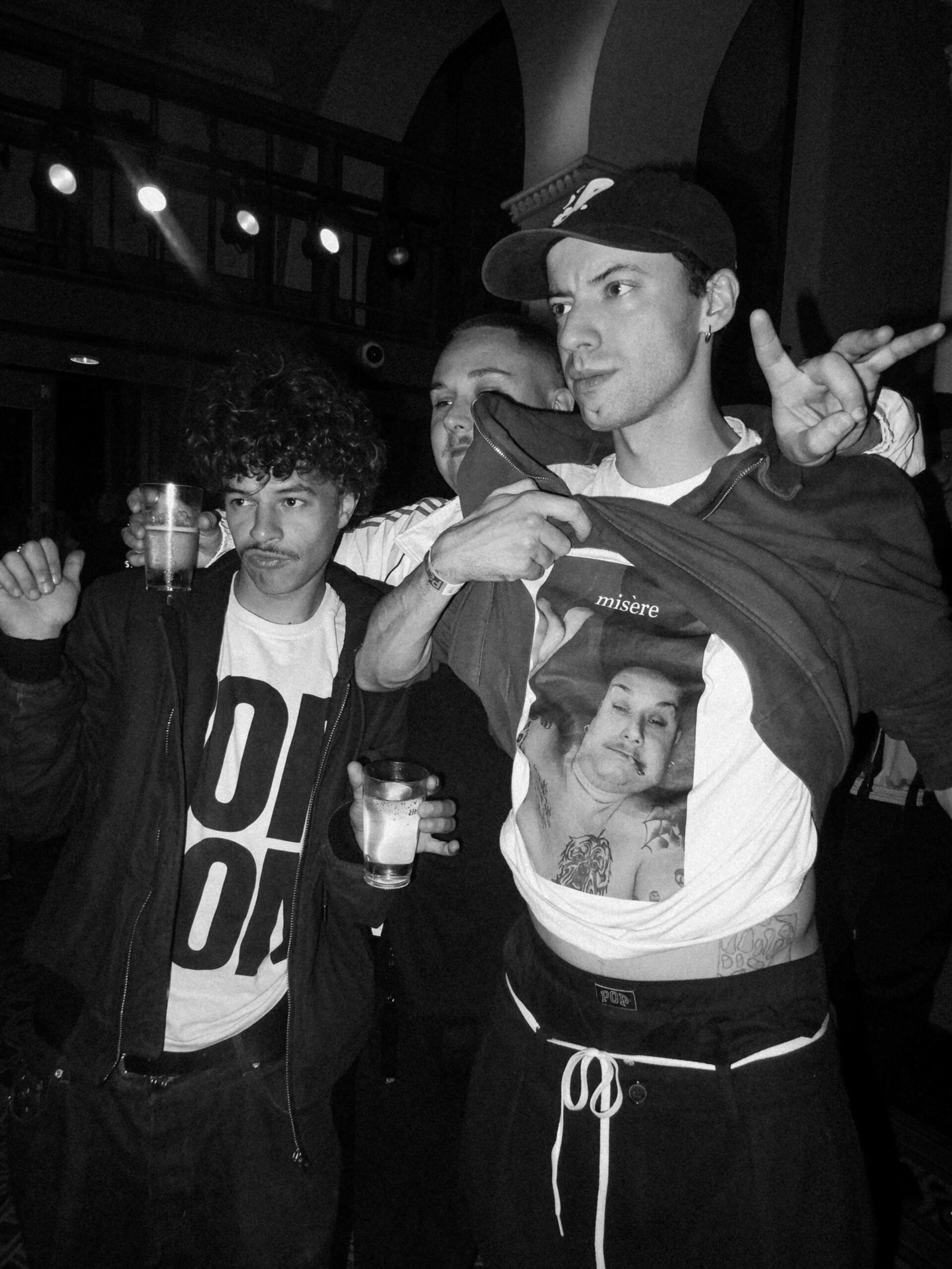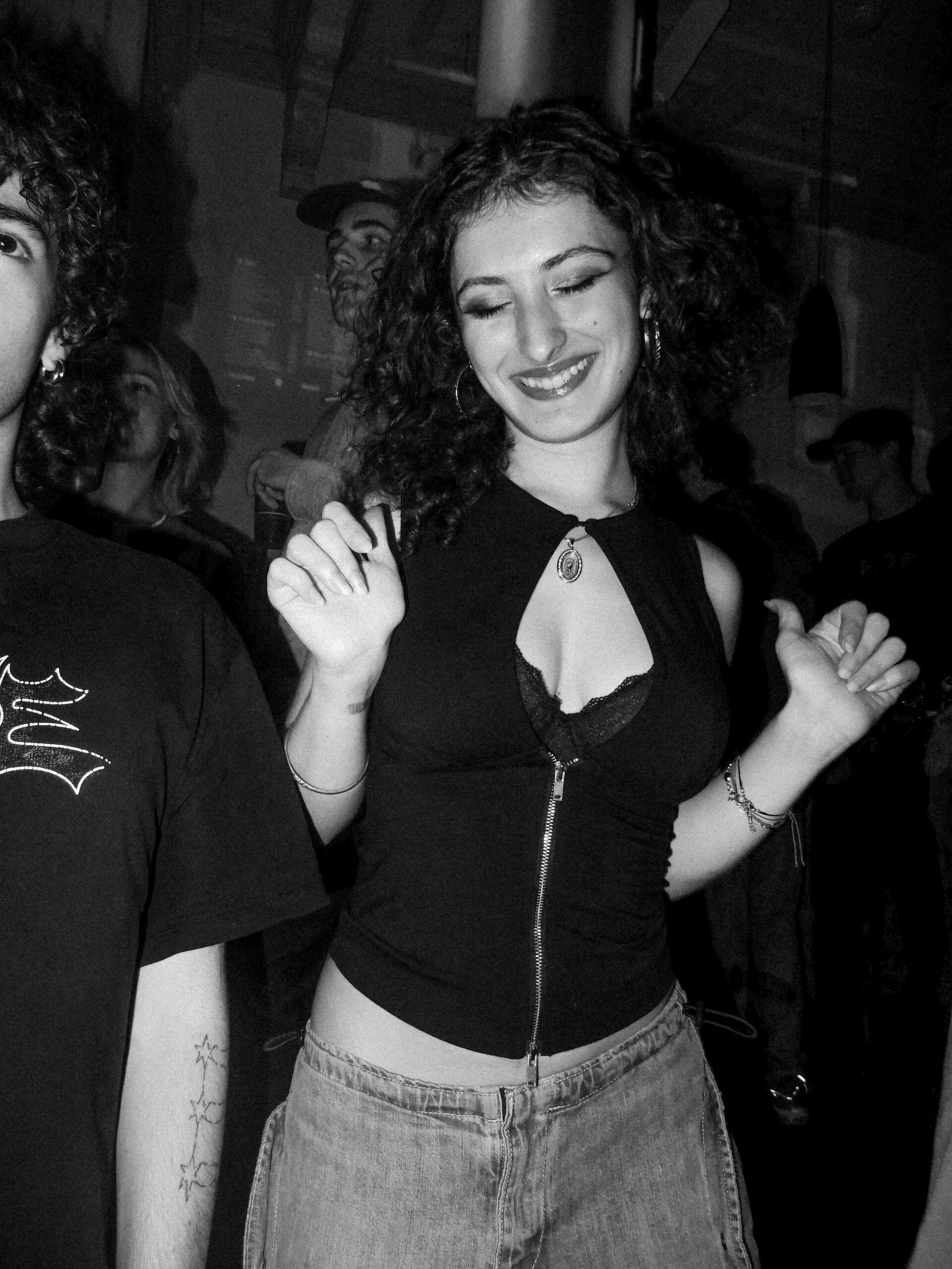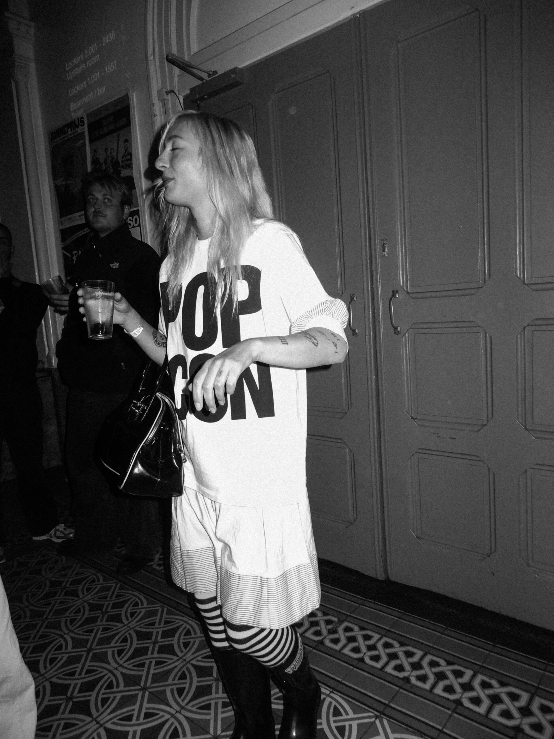Outside, rain-soaked smokers on the steps looked perfectly disheveled, sporting smudged eyeliner and windswept hair. A very 2010s party nostalgia, complete with boards, backwards caps, and oversized graphic tees.