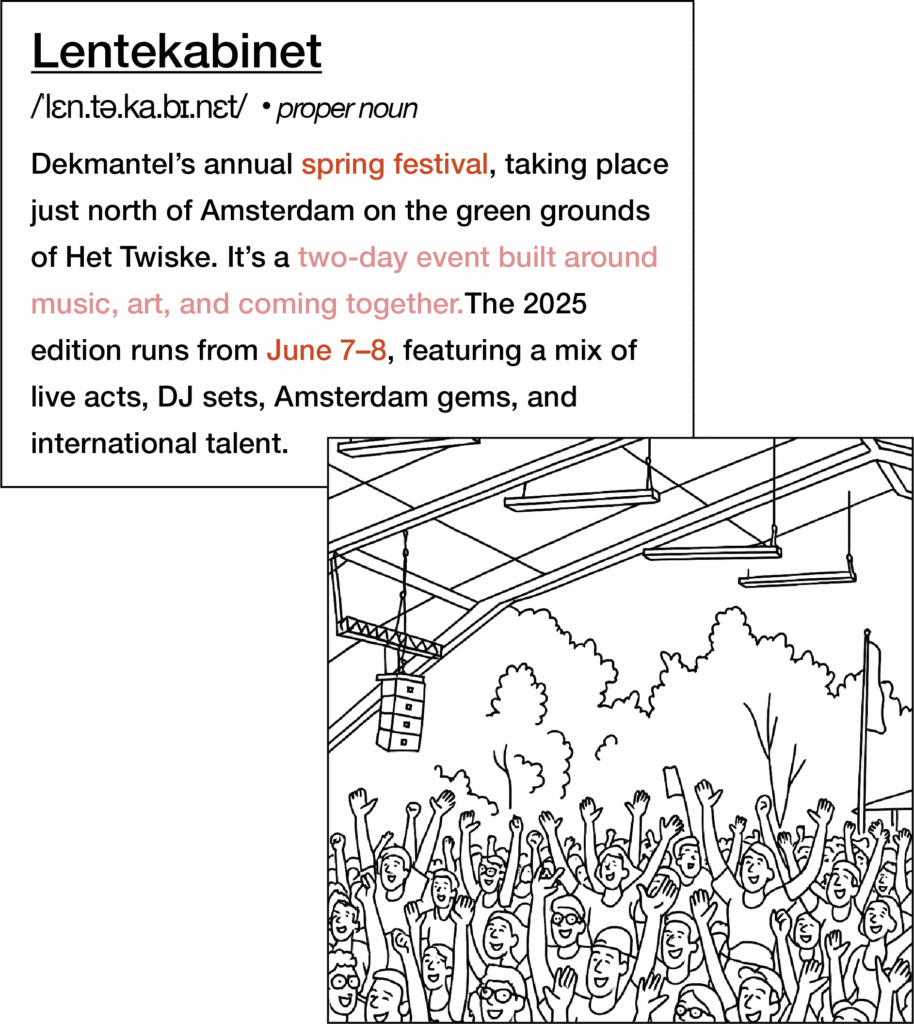 We’ve made our fair share of festival mistakes over the years: forgetting snacks, skipping breaks, going full main character at the wrong moment. So we created a foolproof manual on ‘How to Lentekabinet’. Less rulebook, more soft suggestions. Think of it as a pocket guide to small comforts, boundary-setting, crowd etiquette, and what not to miss.
