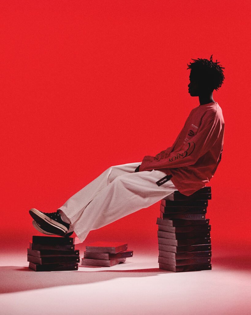 The capsule is envisioned in two-graphic print long sleeves, a hooded sweatshirt, a record bag and a limited edition of Teenage Engineering OB-4 Magic Radio.