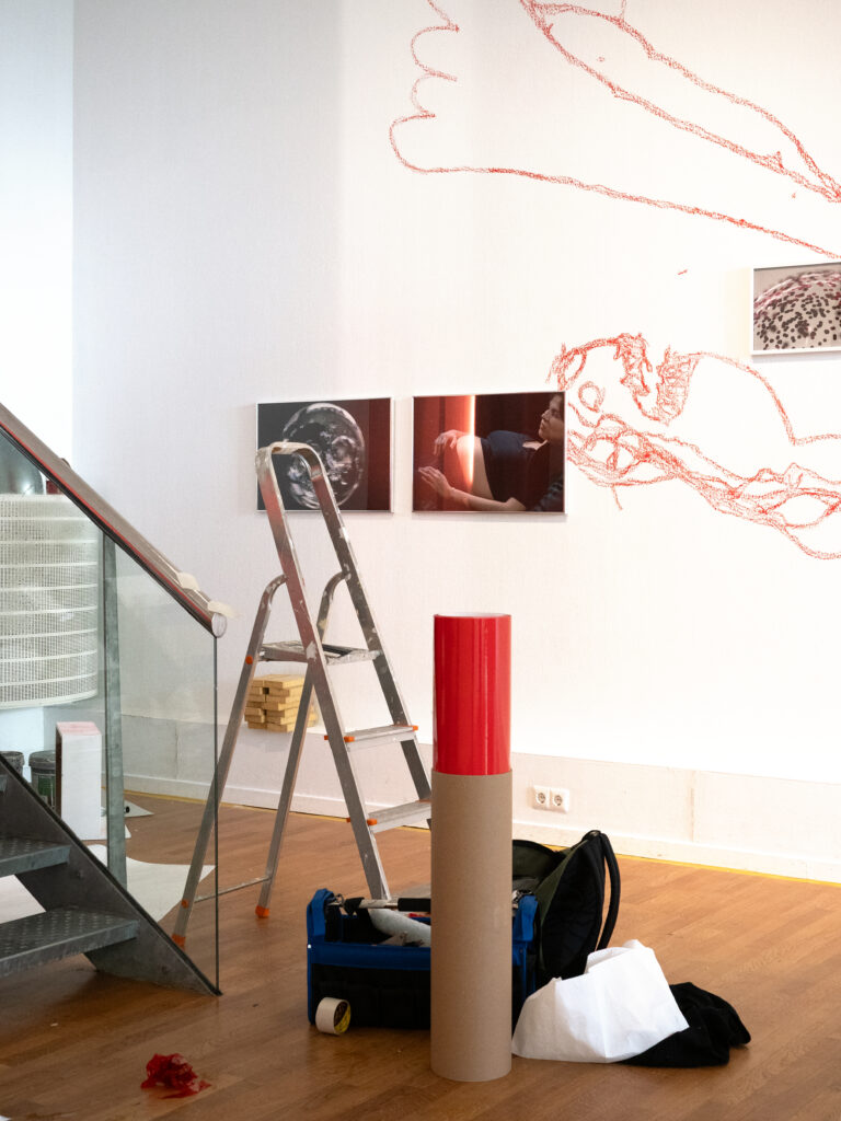 The exhibition adds new layers. The drawings now run through the space like a literal red thread between the photographs.